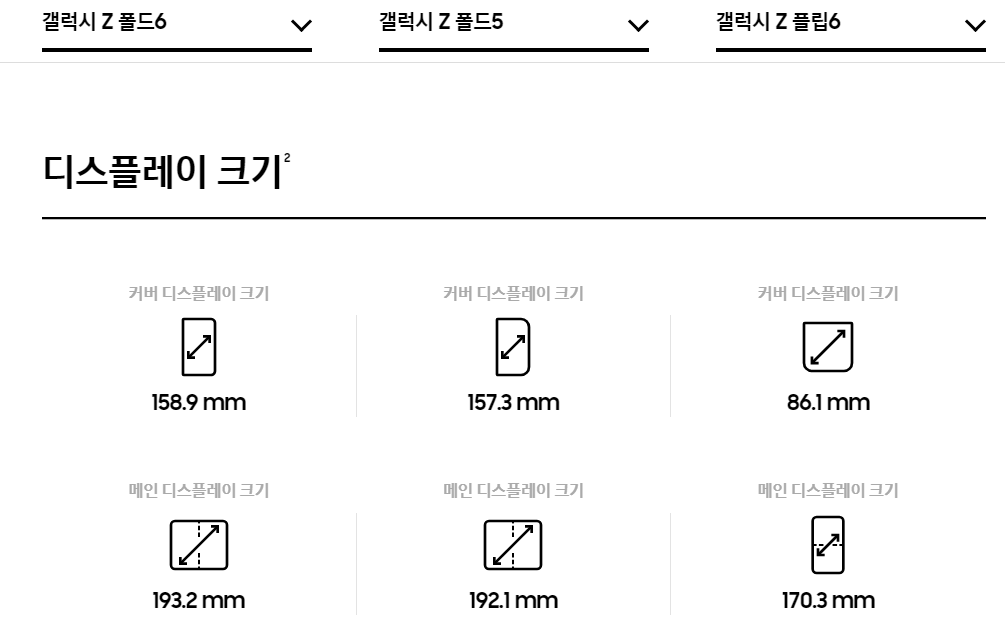 플립 6: 6.7인치 FHD+ Dynamic AMOLED 2X 메인 디스플레이와 1.9인치 Super AMOLED 커버 디스플레이를 제공합니다.