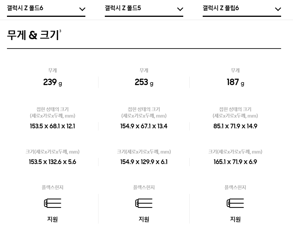 ● 배터리: 폴드 6는 4400mAh 배터리 용량으로, 폴드 5의 4200mAh에 비해 사용 시간이 증가되었습니다.