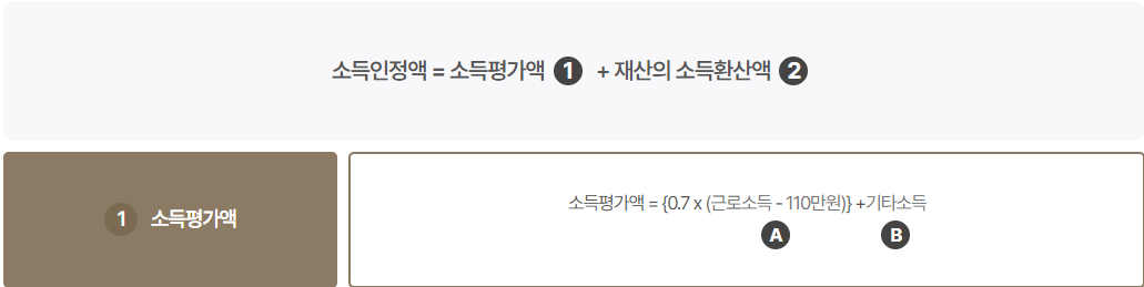 ▶ 소득 평가액: 상시 근로소득에서 월 110만 원을 공제한 후 70%를 적용합니다. 예를 들어, 상시 근로소득이 월 170만 원인 경우, 소득 평가액은 (170만 원 - 110만 원) × 0.7 = 42만 원이 됩니다​