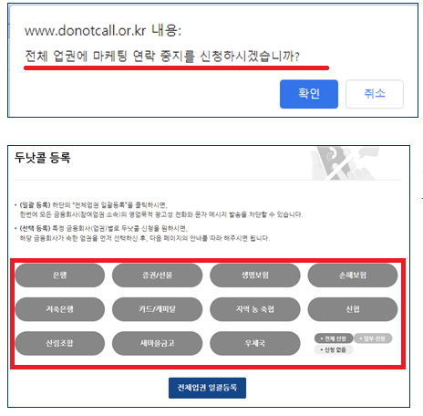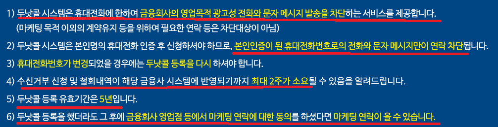 앞으로 금융회사 등의 마케팅 연락을 더욱 쉽고 편하게 차단할 수 있게 되었습니다. 금융권연락중지청구 시스템 두낫콜(Do-Not-Call) 서비스를 확대 개편한다고 금융위원회가 밝혔기 때문입니다. 두낫콜 홈페이지를 통해 간단히 등록이 가능합니다. 두낫콜 서비스를 통해 불필요한 스팸 전화로부터 자유로워지세요.!